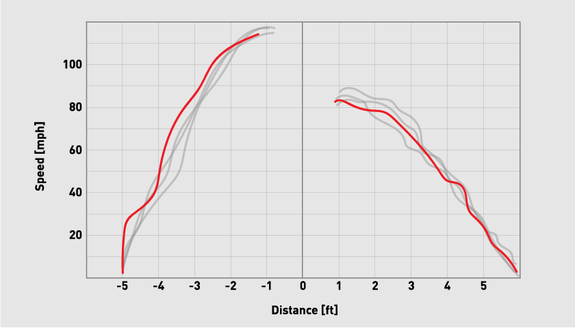 Speed of the club head’s geometric center away from the radar, measured pre and post impact with the ball. From the speed profile, a player can determine swing speed consistency and efficient energy transfer.